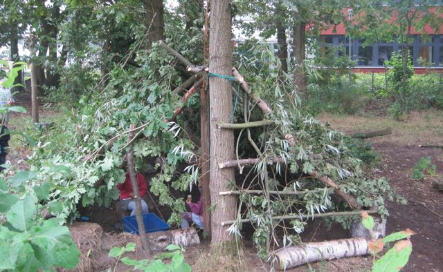 Veröffentlicht am 05/08/201005/08/2010 von tsDas Dach ist fast fertig So allmählich nimmt das neue Waldhaus im Garten der Kita Formen an. Heute hat das Haus eine Dacheindeckung erhalten. Gemeinsam mit Frank haben die Kinder fleißig im Garten Zweige gesammelt und das Dach schließlich gedeckt.