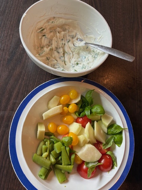 Rebecca waren gestern mit ein paar Kids auf Erntetour im Kitagarten. Da gibt es aktuell nämlich einiges zu entdecken. Gelbe und rote Tomaten oder orangene Paprikas und Basilikum kennen ja viele von zuhause. Das wächst auch bei uns im Gewächshaus. Aber kennt ihr Kohlrabi mit Schneckenschleimspuren? 20cm lange Bohnen, die bis in den Himmel wachsen? Nasse und sandige Petersilie? Und Fallobst-Äpfel mit Stellen? Kann man nicht essen? Oh doch :) und es ist nach dem Waschen und Putzen sogar ausgesprochen lecker. Die Bohnen haben wir geschnitten und gekocht, Tomaten, Paprika und Kohlrabi gab es roh mit den Basilikumblättern. Dazu haben wir uns noch einen selbst gemachten Kräuterquark mit Petersilie und Schnittlauch gemacht und die Äpfel haben wir zwischendrin genascht.